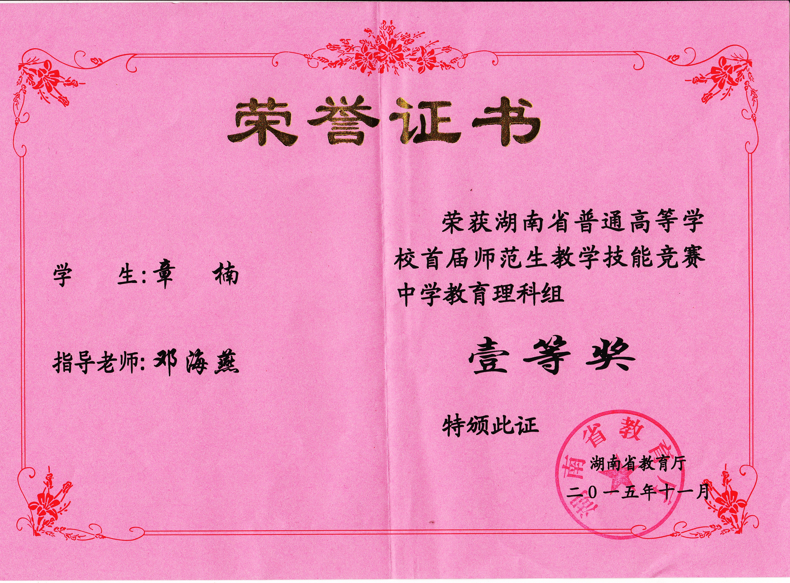 湖南省首届师范生教学技能竞赛中学教育理科组一等奖