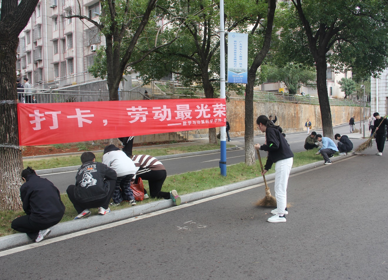 活动开展井然有序,同学们以小组为单位分区域进行打扫。他们有的手拿清扫工具,时而弯腰,敏捷而又细致地在街道上清扫;有的双手套上手套,时而半蹲,时而俯身,同样细致地不放过任何犄角旮旯里的垃圾。整个校医院的周围都是同学们认真忙碌的身影。