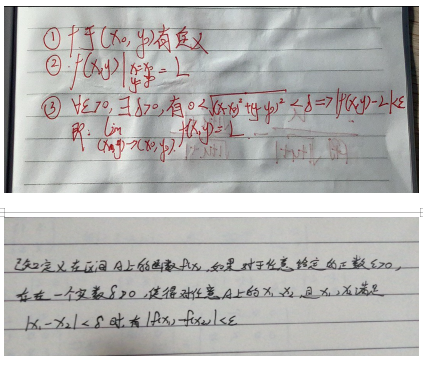 谭老师在课堂上布置讨论任务“怎么用语言描述二元函数的连续性?”,展示同学们有代表性的回复答案,逐一进行分析,指出错误之处,加强对知识点的掌握及二次认识。