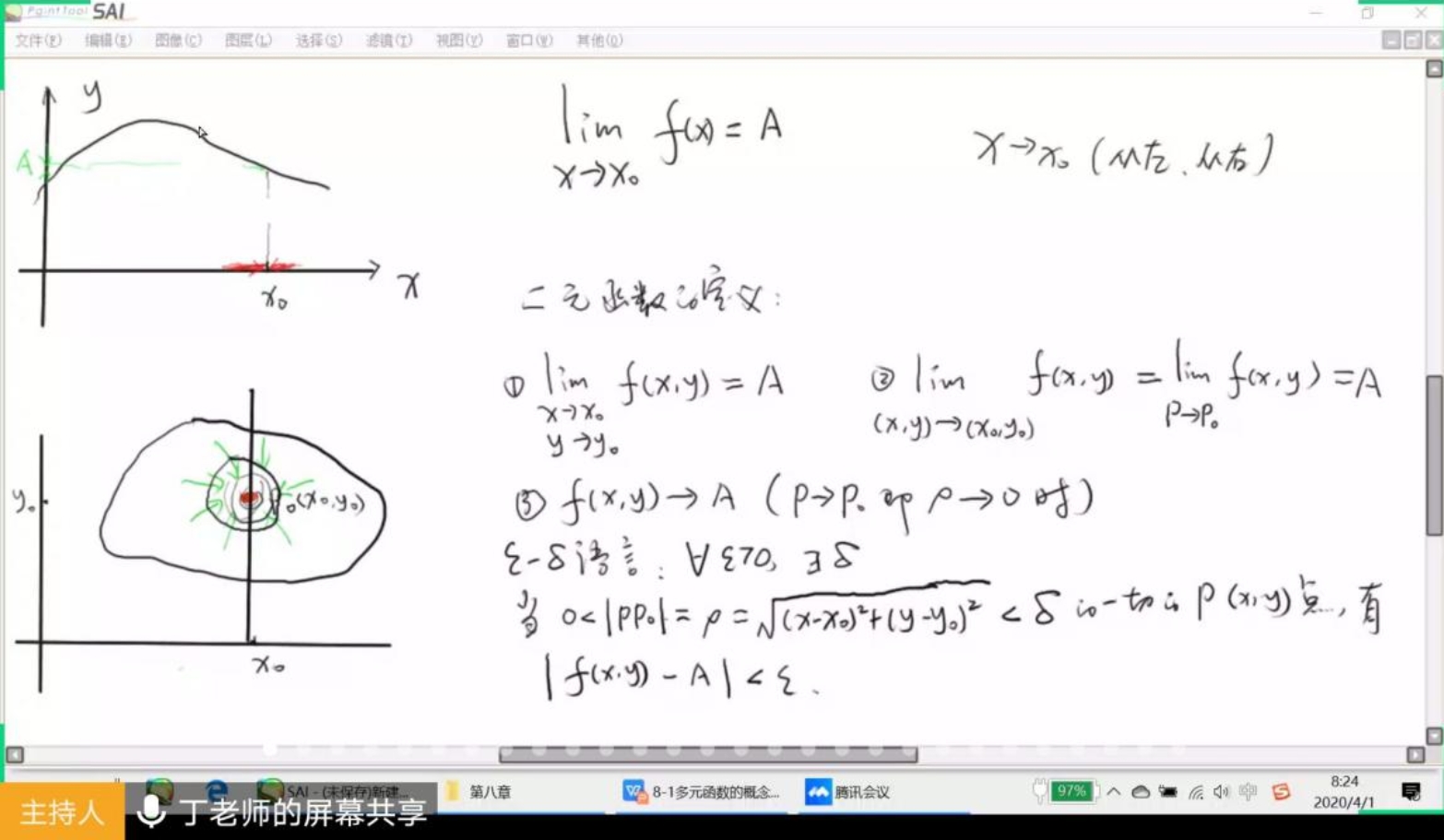 4月1日1、2节的公开课丁爱霞老师使用“腾讯会议”平台开展线上直播教学,主讲《高等数学A(2)》多元函数的极限、连续性及闭区域上连续函数的性质。