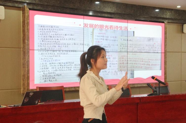 最后,来自益智中学的史鑫艳老师以《整式》为例,从实际出发,通过对教材和学情的分析,明确教学目标,并对情景引入、新知探究、典例分析、课堂小结、当堂检测和课后作业六大教学环节进行了精心设计,让在座的同学们更能理解教学的意义与目的,从而提升与此相关的教学能力。史鑫艳老师也指出,我们应当将教学与爱国主义情怀相结合升华课堂,这样更能实现员工的德育与智育的发展。