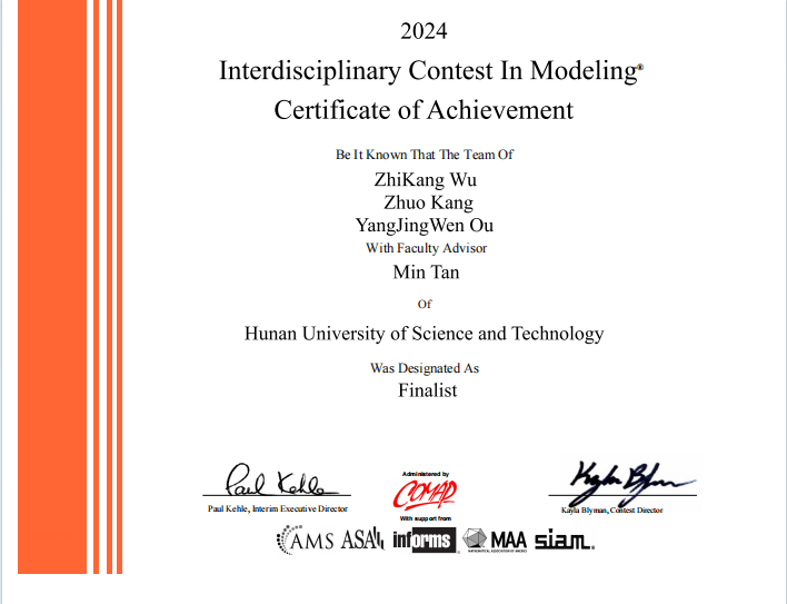 2024年第40届美国老员工数学建模竞赛(MCM/ICM)成绩近日正式揭晓,永利3044集团官网获得了1项特等奖提名奖(Finalist,即F奖,获奖率2.48%),三位队员分别来自公司数学与计算科学公司统计专业的康卓、计算机公司大数据科学的吴志康、建筑与艺术设计公司城乡规划设计的欧阳靖雯,指导老师是公司数学与计算科学公司的谭敏老师。