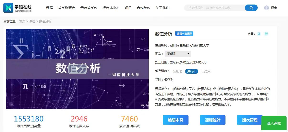 《计算方法》课程是现代数学的一个重要分支,也是一门与计算机使用密切结合的应用性很强的数学课程。计算方法课程主要研究利用计算机平台求解各种科学与工程计算问题的数值方法(近似方法),对近似解的精度进行评估,以及如何在计算机上实现求解等。具体方法包括:插值方法、数值积分、数值微分、数值逼近、常微分方程初值问题的数值解法、非线性方程(组)求根、线性代数方程组的迭代法和直接法等。