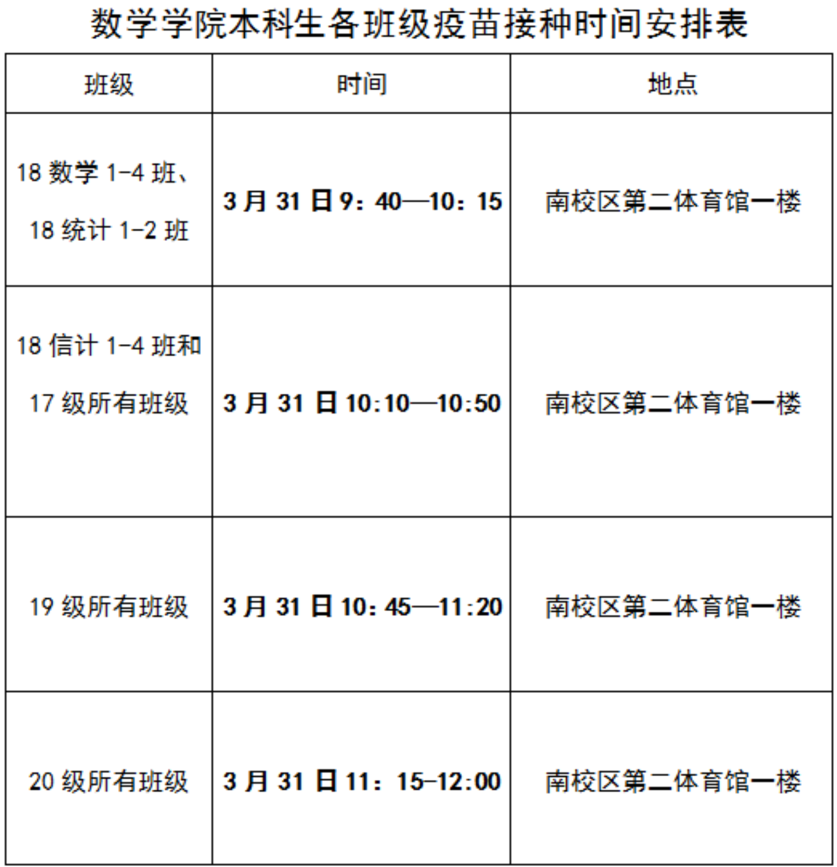 按照公司《关于做好新冠病毒疫苗接种工作的通知》和教务处《关于新冠病毒疫苗接种期间停课的通知》,现将各班级的接种时间进行调整(如下图),请同学们按照时间表的安排进行接种。各年级年级长需提前告知31日3、4节课的任课老师。如给大家带来不便,敬请谅解!