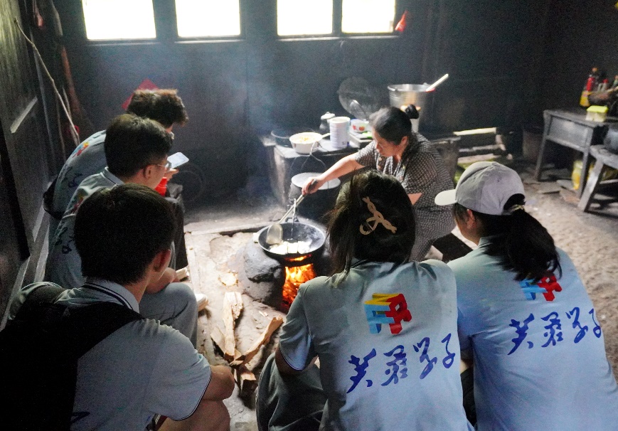油茶古艺,薪火相传。一捆木柴,一只茶篓,一把汤勺,两口铁锅,古朴的吊脚楼中,熊熊燃烧的柴火,空气中弥漫着绵绵的油茶香。火炉旁,团队成员在85岁尧奶奶的指导下,对油茶的制作过程进行观摩学习,深刻体悟油茶这一技艺背后的千年文化底蕴。“油茶是城步苗乡世代相传的古艺,其制作过程分为五步,一是制阴米,糯米浸泡、蒸熟、晒干或烘干。二是做茶饼,春夏采新茶,煮后加米汤捏饼晒干。三是炒主料,阴米炒焦黄,黄豆、花生炸香脆,糍粑煎软糯。四是煮茶汤,茶饼煮水,捞茶捣烂,再煮成浓茶汁,加调料。五是冲泡撒料,将主料分放于碗中,冲入茶汤,撒香料。”尧奶奶介绍道。