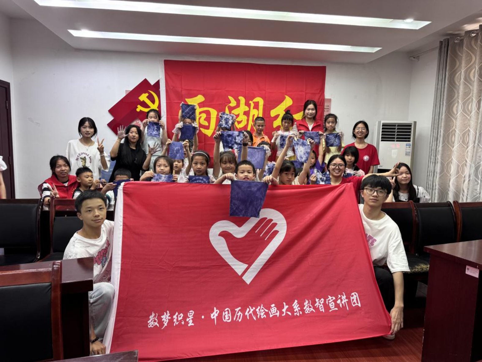 为强化儿童文化底蕴,继承与光大中华优秀传统文化之精髓,7月8日,永利3044集团官网数学与计算科学公司数梦织星·中国历代绘画大系数智宣讲团作为公司在2024年团中央“中国历代绘画大系”志愿宣讲项目唯一入选团队与“雨湖红”志愿服务团队共联合开展"绘出文化之美,爱语扎染的情深意长"活动,组织雪园社区公司暑假班的小朋友们编织出一幅壮丽的文化长卷。