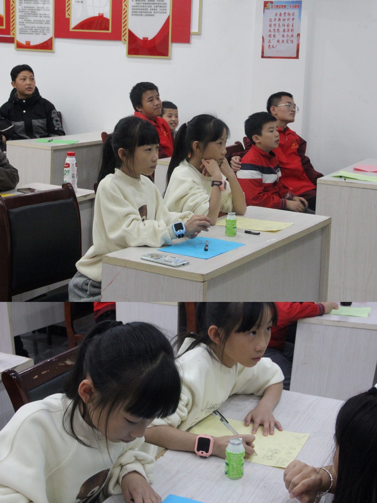 当主讲人教授战术手势时,台下小朋友们精神抖擞,兴致勃勃地模仿学习。在一伸一缩、一转一弯,这些手势尽现军人行动的默契与高效。最后,大家一同全神贯注地观看了展现红军战士英勇抗战的热血视频,爱国之情与崇敬军人之意在如同汹涌澎湃的潮水般在每个人心中激荡不已。