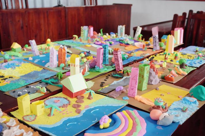 除开设专业兴趣课外,团队成员积极响应国家政策,立足当地教育实情,在数梦阳光课堂中开设了绘画大师、音乐鉴赏、语言学习、手工制作、红色故事五堂兴趣爱好课。绘画课简练笔画勾勒山水画卷,音乐课律动合唱小游戏激发积极性;语言课辨析字音教学普通话,手工课粘土勾画眼中蓬瀛之美;红色故事课述说军民鱼水情。每一课堂的匠心独具,同学们在欢声笑语中深度探索,通过实践操作和大胆展示的大舞台,逐步构建起智慧与乐趣并蓄的殿堂。