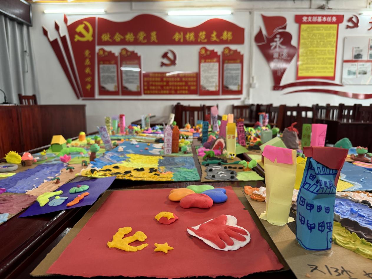 粘土是连接现实与想象的桥梁。随着形状和色彩的不断变化,粘土在孩子们的手中有了灵魂,兔子、花朵、溪流、房子,蓬瀛村的样貌便跃然纸上。但令人惊奇的是,年幼的小朋友不仅捏出了我们熟悉的房屋、美丽的花草,还捏出了活灵活现的红军司令部旧址、稻田党徽等红色作品。“这就是我们村的一部分!”蓬瀛的红色文化早已与这里的每一个大人、小孩融为一体,给所有蓬瀛人的内心都烙下了红色印记。