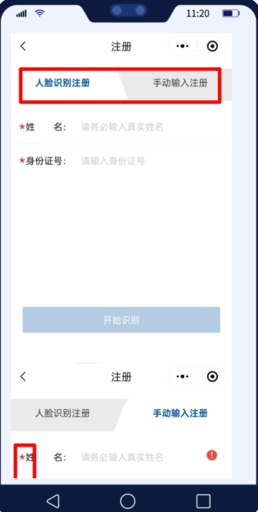 ❷您可以选择人脸识别和手动输入两种方式进行注册。