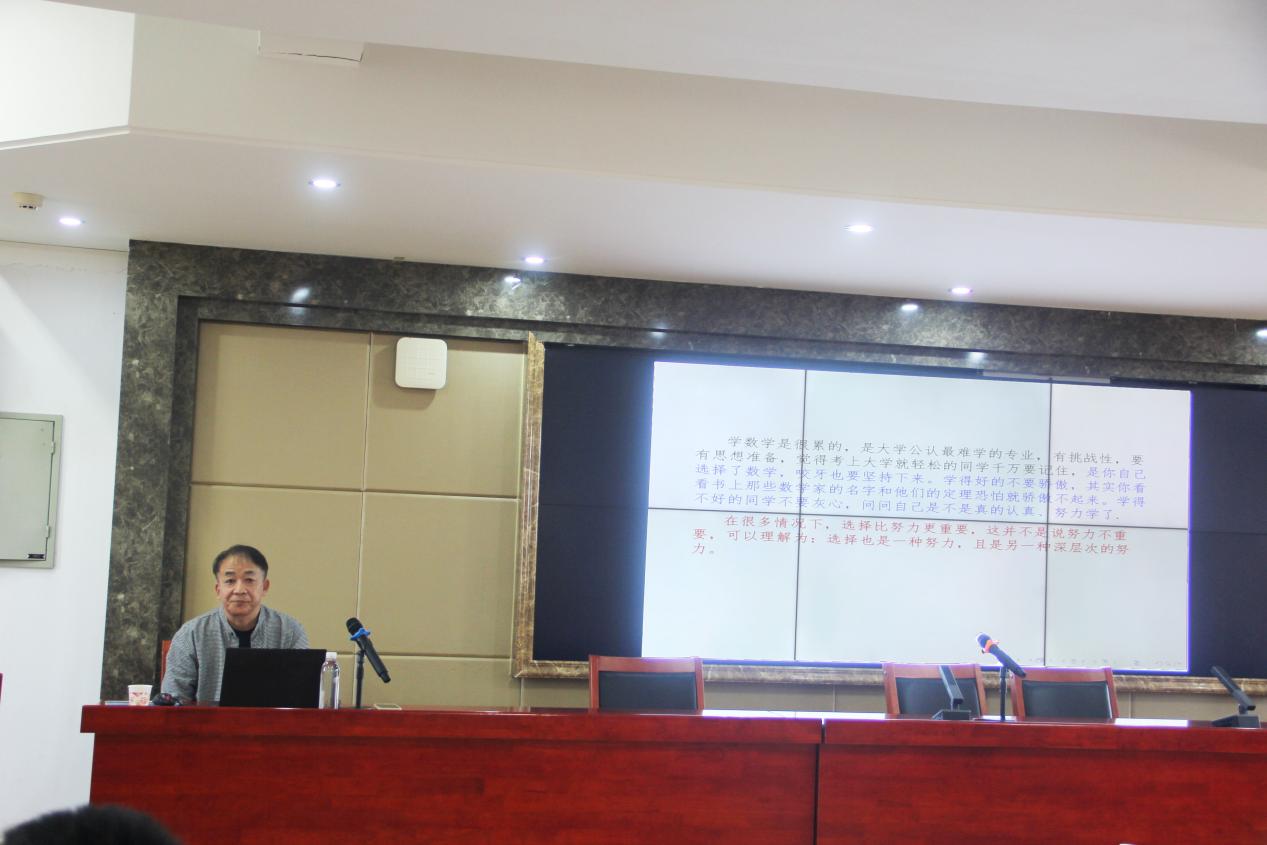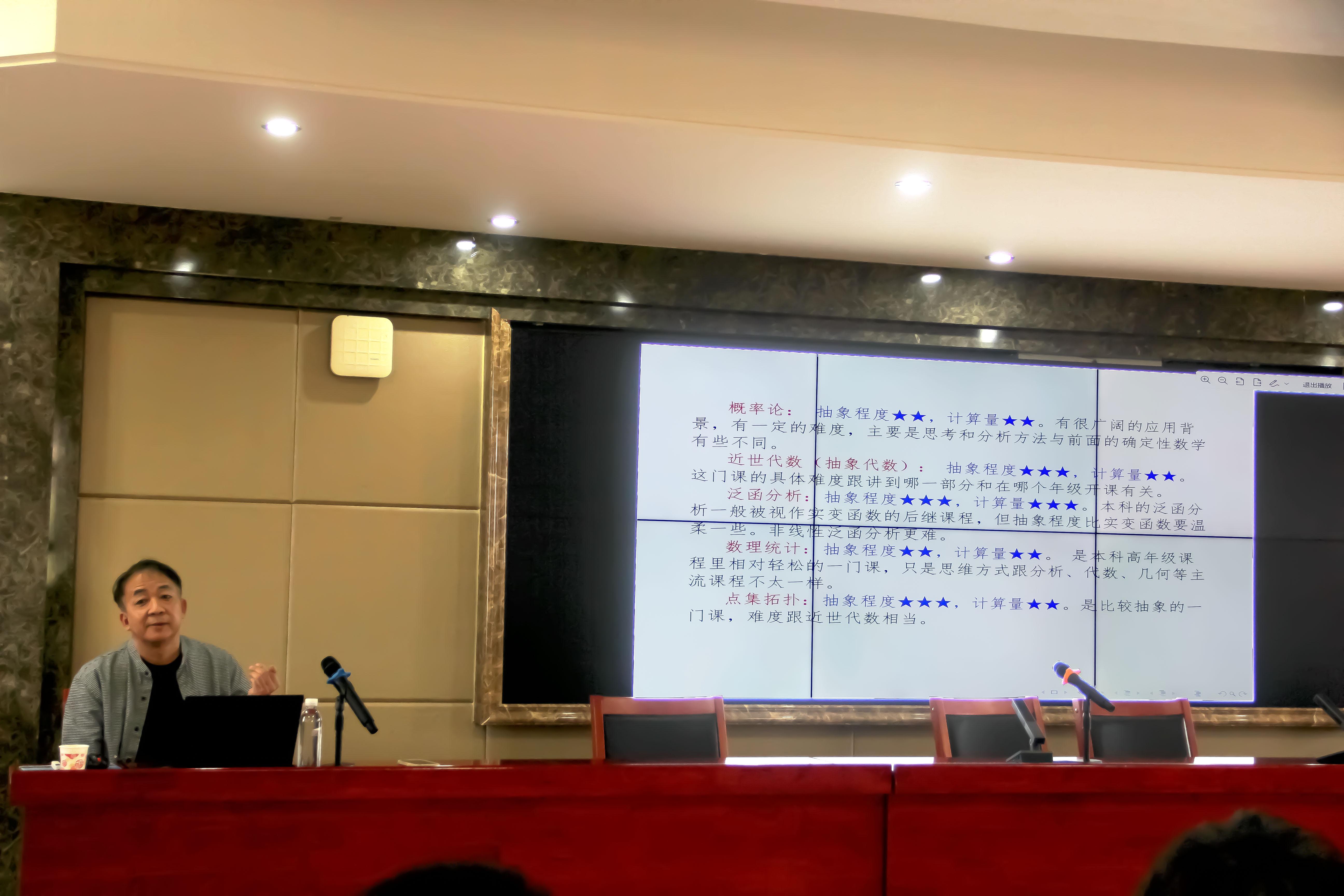 首先,申建华教授对数学专业课程做了简介,分为基础课程,核心课程和拓展课程,让同学们对其有大致了解,为以后的生涯规划做好铺垫。同时,申教授对各数学课程的抽象度、计算和推导复杂度三方面做了简单的介绍,建议同学们做好预习,善于反思总结。