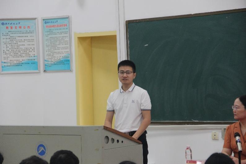 信计系副主任、教师代表黄铮发言。他向新生提出三点建议:建立目标、保持初心、享受过程。黄老师认为,大学美好而短暂,同学们只有设立好短期和长期目标,勿忘学习初心,珍惜校园时光,才能成为更好的自己。