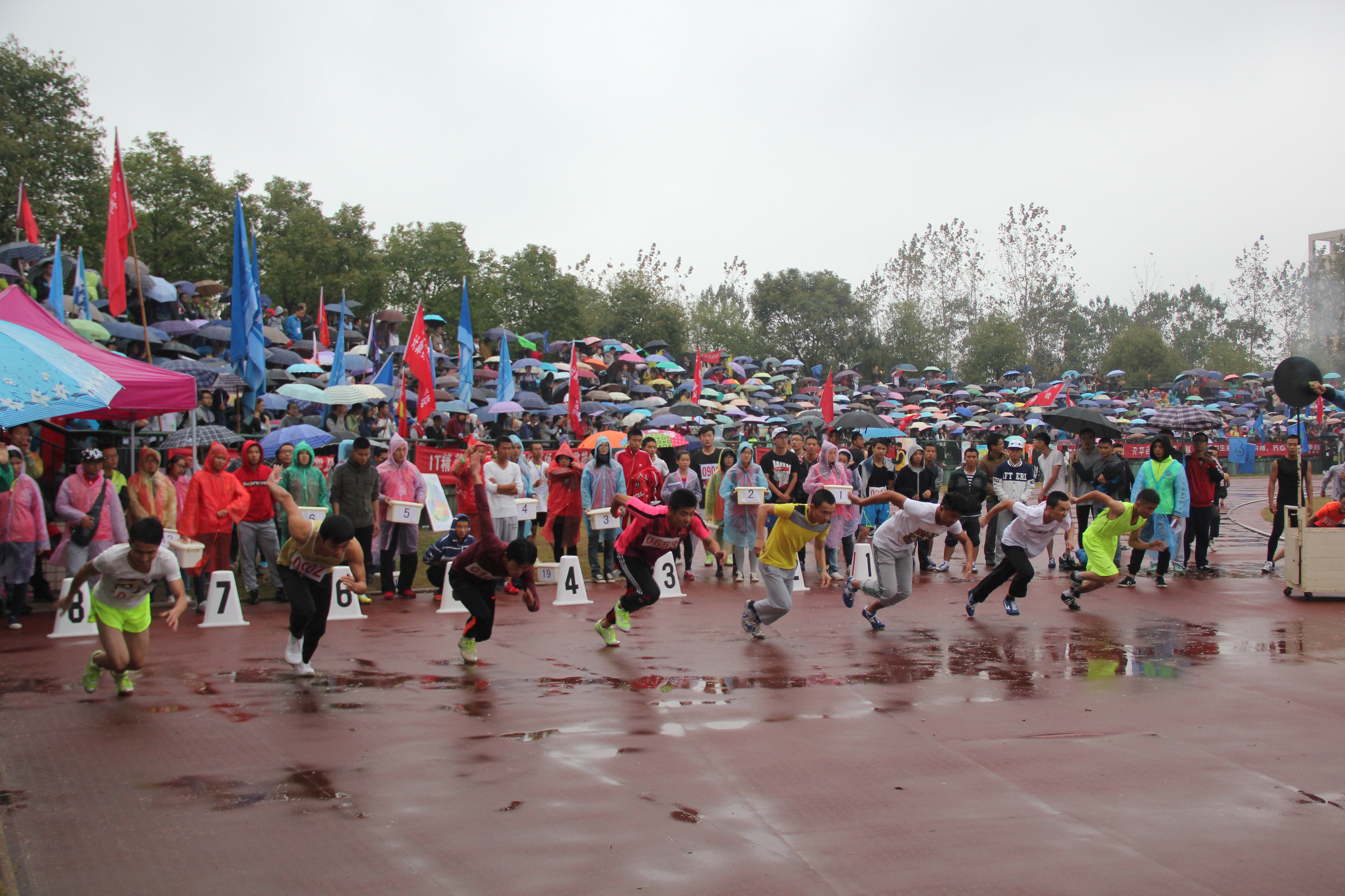 继10月29日秋季运动会的开幕式后,10月30日,女子100米、男子100 米、男子三级跳远等竞赛项目依次展开。虽然天公不作美,一大早便下起蒙蒙细雨,但这丝毫不影响师生们参与运动会的热情,赛场上,运动员们不负之前的努力训练,用自己最好的状态去奋战。每当公司的运动员从观众席前跑过,同学们便大声呼喊运动员的名字,给予他们最大的支持和鼓励。