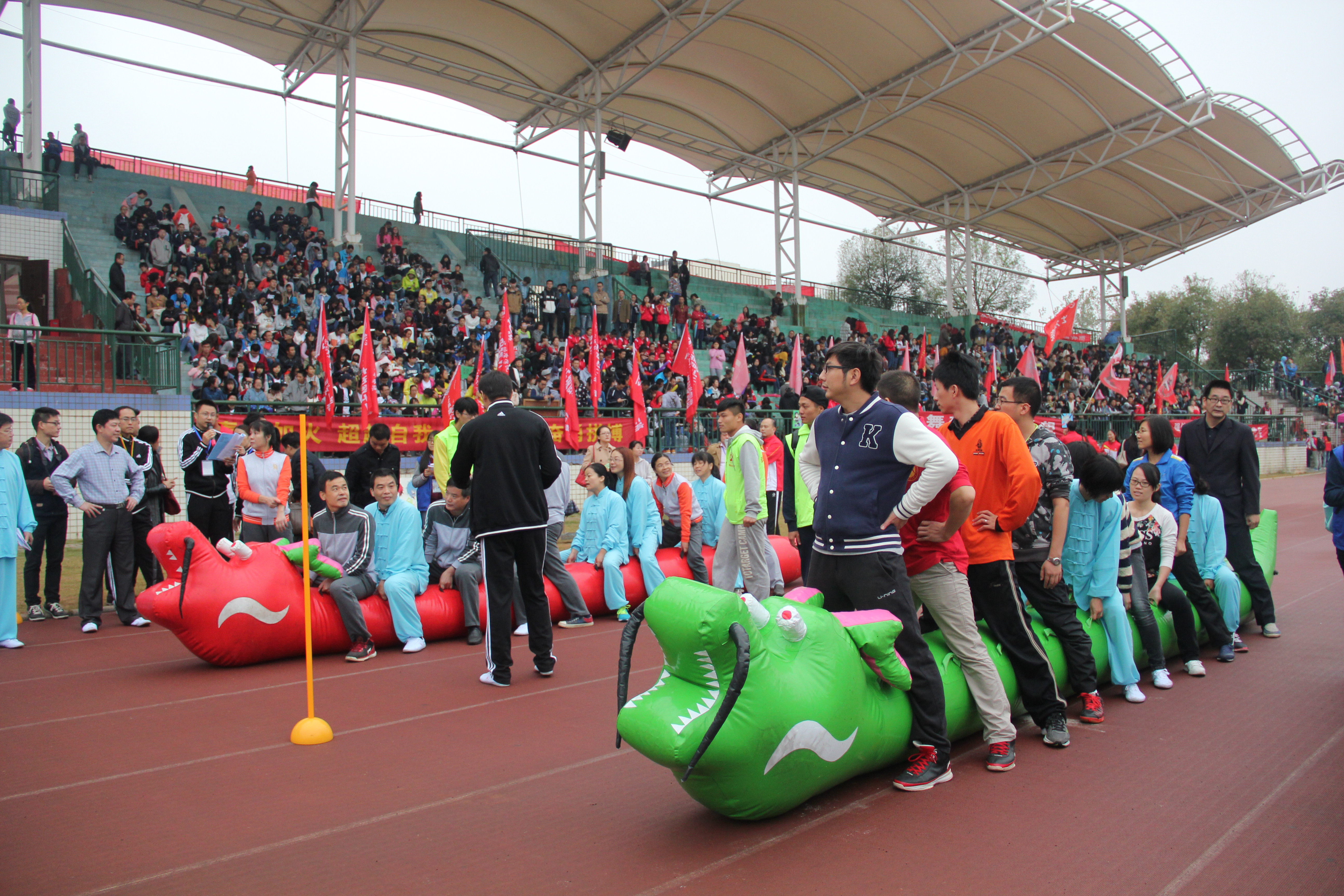 运动场上的鼓声、哨声、欢呼声此起彼伏,鲜艳的院旗、班旗、五星红旗在空中飞舞,场面十分状阔。我们了解到,早晨天还未完全亮,负责布置赛场的工作人员就已经开始忙碌起来,纵使天气很冷,偶尔还会下雨,他们仍然一次次的调整,直到最后完美地呈现给大家。