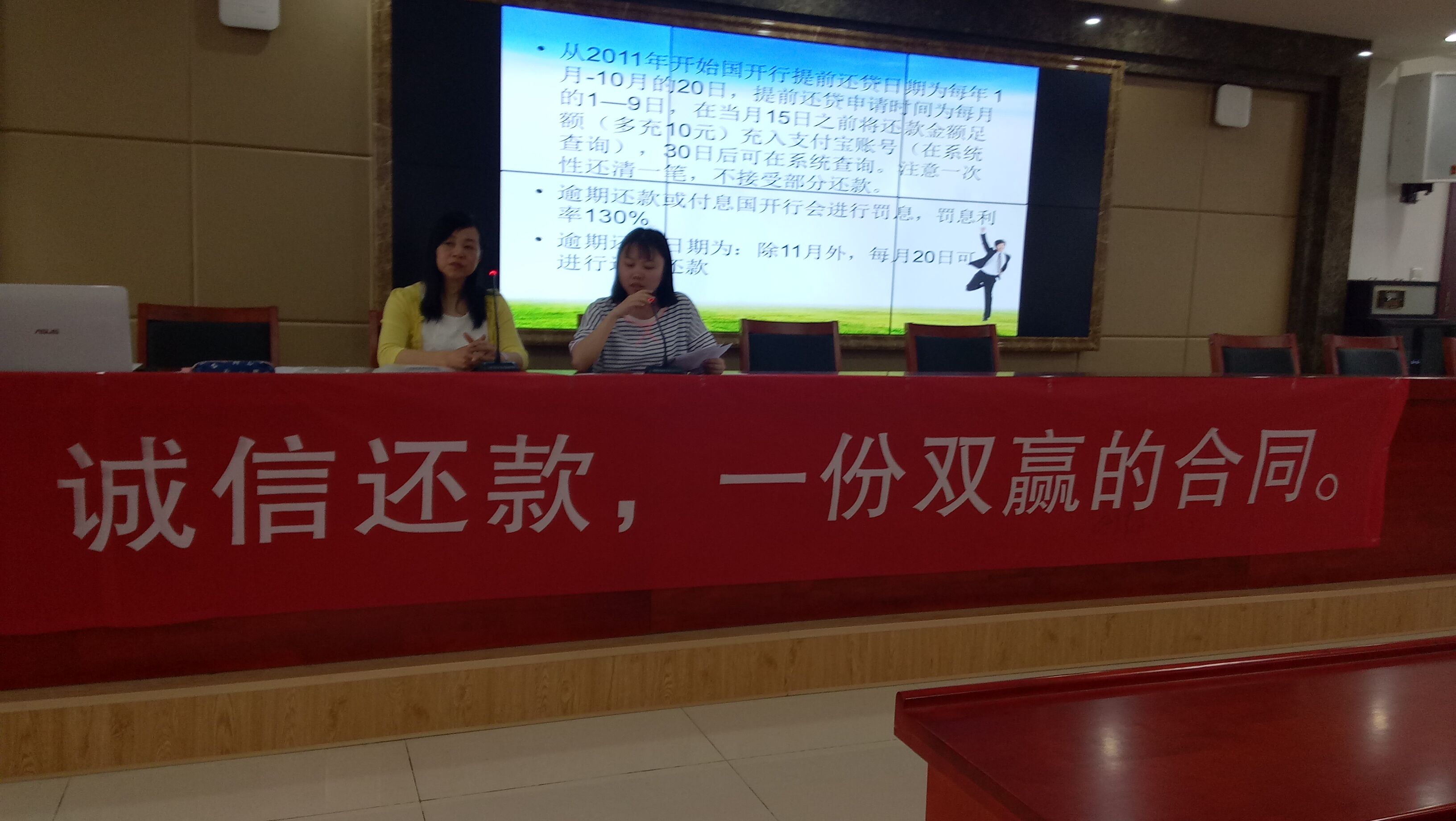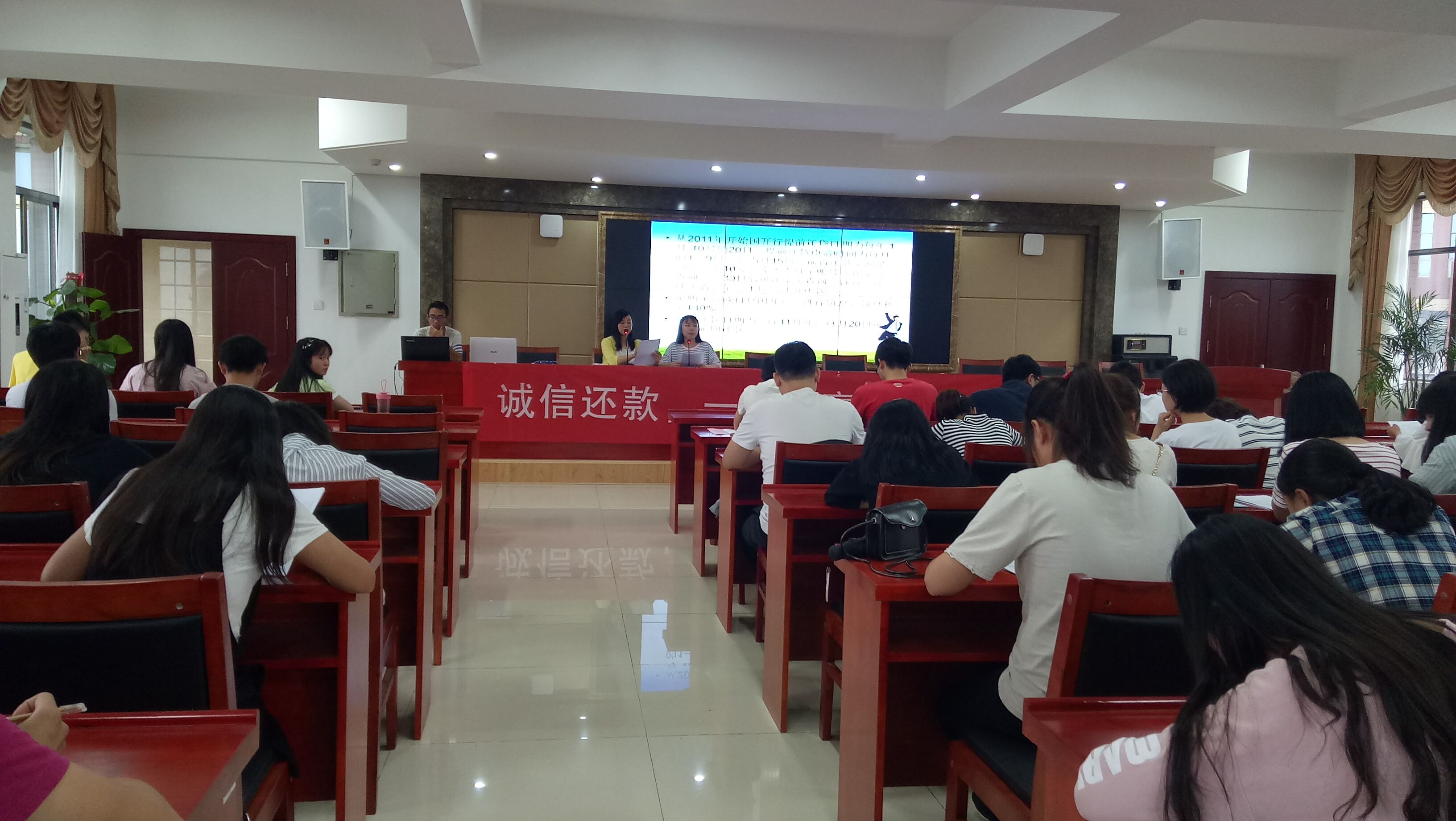 会议主要内容是对贷款相关事宜进行讲解,其中重点谈论了还款相关事宜及关于贷、还款消息的获取。刘晋华老师上台为此次活动点评讲话及答疑解惑后,由员工填写还款确认表及联系方式登记表。会议结尾由刘东海副书记上台为此次活动进行总结性的讲话。