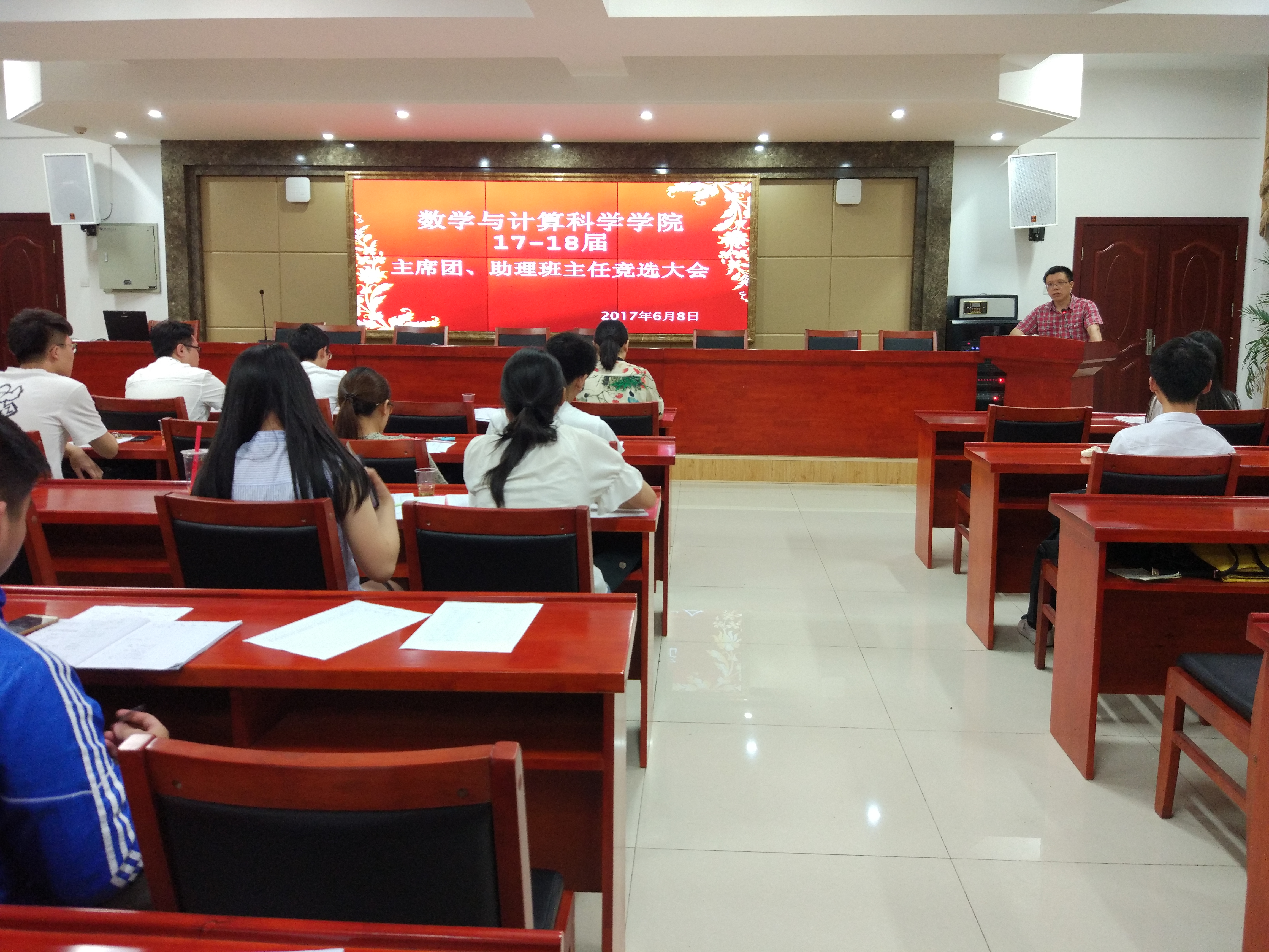 2017年6月8日星期四晚19点数学与计算科学公司进行17-18届主席团、部长及助班竞选,主席团及助班竞选在理科楼A601、部长竞选在理科楼A101同时进行。本次大会的选拔聘用小组组长为公司党委副书记刘东海,副组长为刘学泳老师,小组其他成员有刘晋华老师,以及员工会主席佟明徽和团一副陈姣龙。还有第16-17届团委、员工会主要干部与16级各班代表担任评委。