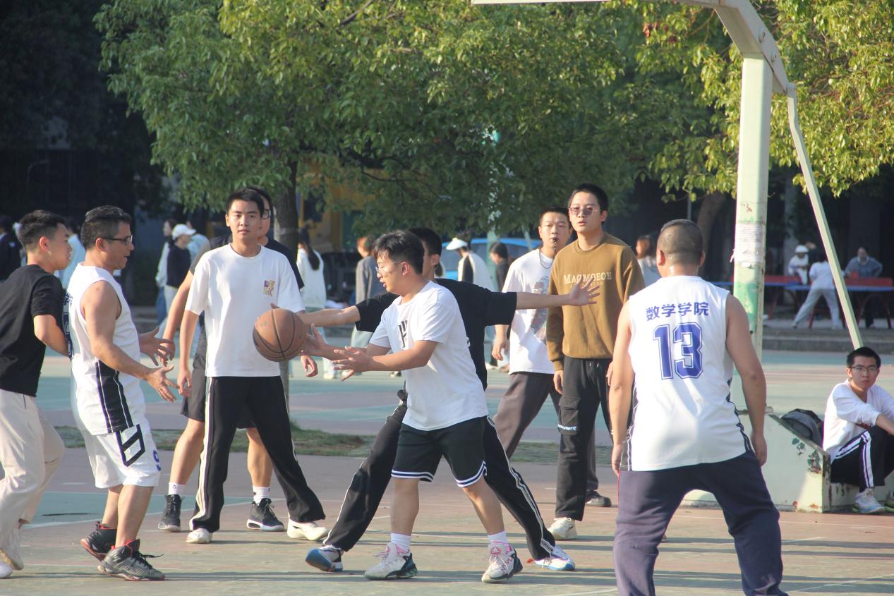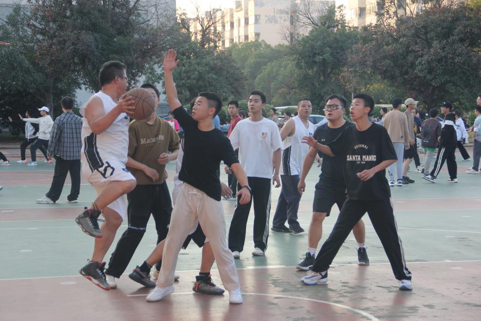 地平线点点吞噬着太阳,光影越拉越长,比赛仍激烈地进行着。虽然汗水虽浸透了球服,但球场奔跑的师生们的比赛热情却未减半分。每个人的注意力都高度集中,紧盯对手,趁机抢断,找准机会,接球上篮,最后完美落框得分!