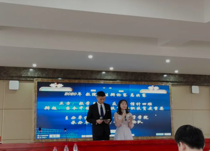 主持人简短的开场白之后,20数学3班与20级信计4班分别作为正反两方,参赛双方进行了自我介绍以及观看了来自本班同学的加油视频,就“当代中国,经济扶贫和知识扶贫哪个更重要”这一辩题展开了激烈的角逐。