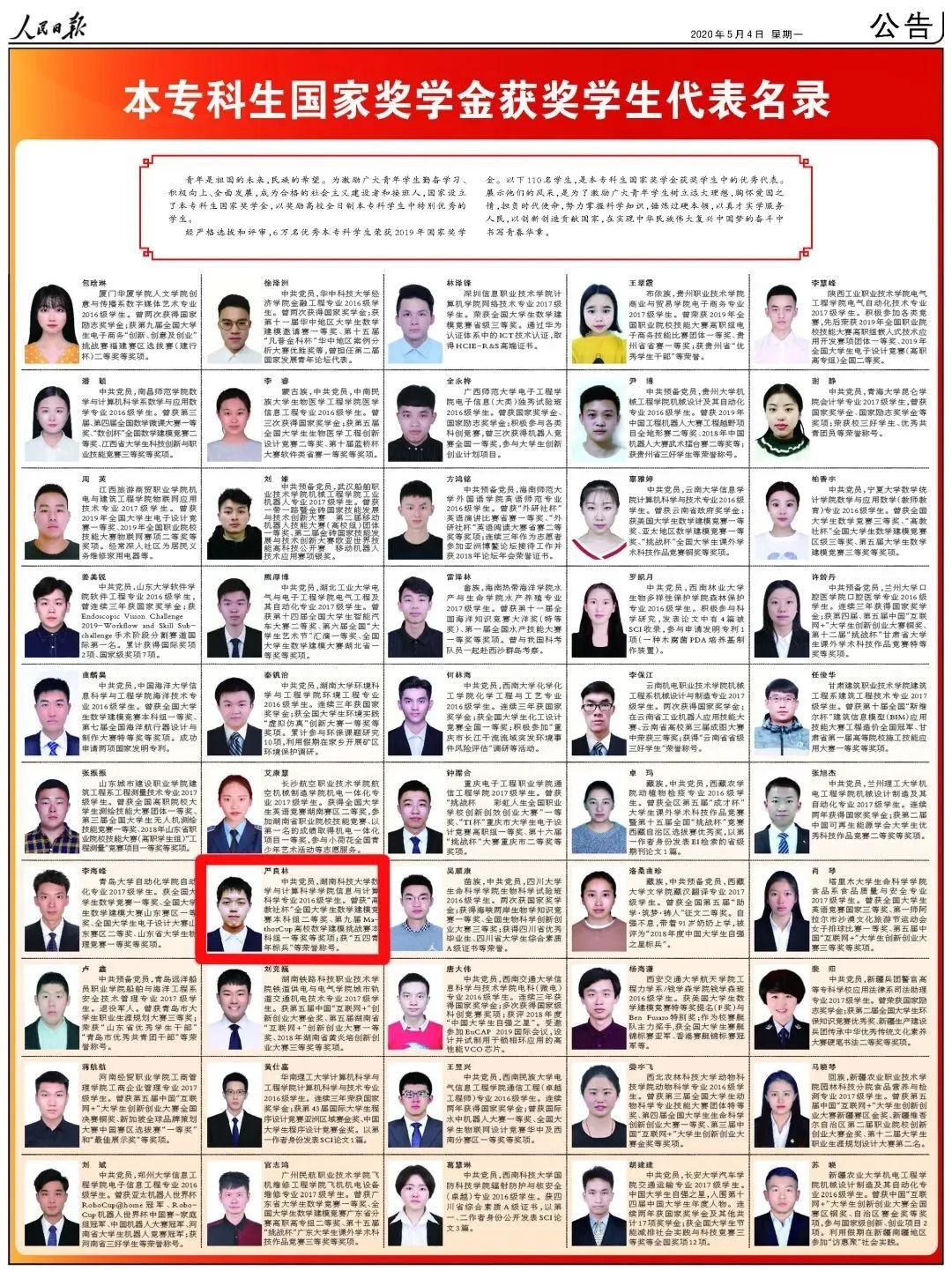 青年是祖国的未来,民族的希望。为激励广大青年员工勤奋学习、积极向上、全面发展,成为合格的社会主义建设者和接班人,国家设立了本专科生国家奖学金,以奖励高校全日制本专科员工中特别优秀的员工。经严格选拔和评审,6万名优秀本专科员工荣获2019年国家奖学金。2020年5月4日,公司数学与计算科学公司信息与计算科学专业2016级严良林同学入选了人民日报本专科生国家奖学金获奖员工代表名录。