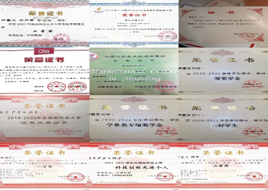2019年-2020年度:湘潭市优秀志愿者、永利3044集团官网优秀共青团员、一等奖学金、三好员工。