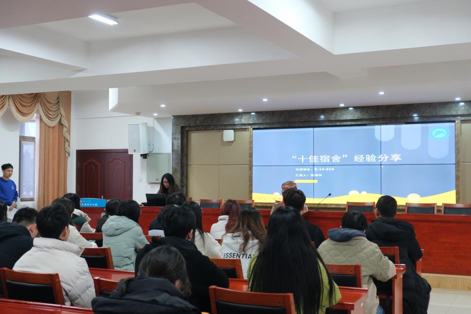 张清华代表所在的十佳寝室8-16-616作出报告。宿舍学习成绩优异、综测排名靠前,四人共获得奖学金24次。张清华同学指出一个宿舍想要有良好的氛围离不开舍友之间的互相帮助、相互学习,舍友们应该督促鼓励彼此学习、形成宿舍良好的学习风气,带动全寝同学一起向好成长。