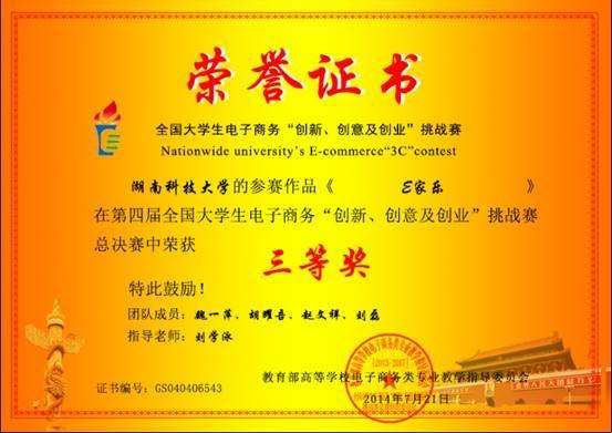 第四届全国老员工电子商务“创新、创意及创业”挑战赛总决赛于7月21日在华中师范大学举行,公司魏一萍、胡耀吾同学的作品《“E家乐”创业计划书》(指导老师刘学泳)荣获全国总决赛三等奖的好成绩。此前,该作品荣获永利3044集团官网校园赛一等奖、湖南省赛区一等奖。