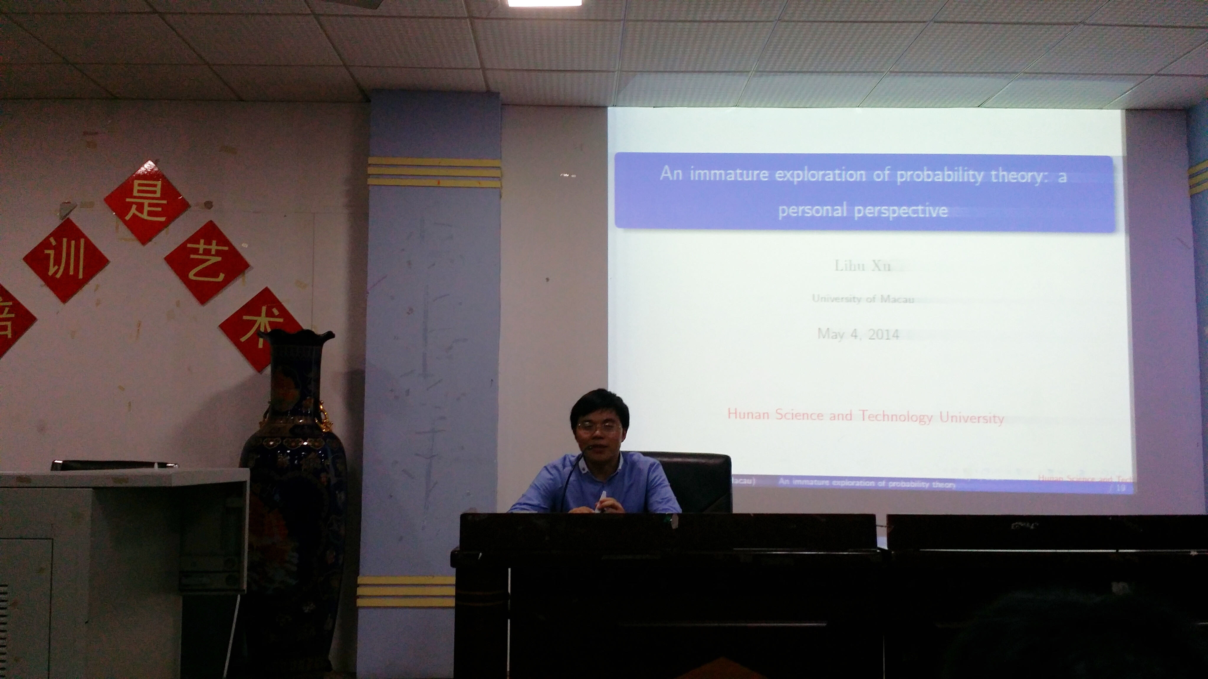 应公司邀请,澳门大学徐礼虎教授于5月4日19:30在第八教学楼304室作了题为“概率论与随机过程简介”的专题讲座,公司部分老师以及全体应用统计专业的员工聆听了此次讲座。 徐教授从概率论的历史入手,详细讲解了概率论的发展过程以及随机过程的引出与利用,介绍了概率论的部分重要公式和贡献卓著的数学家。 此次讲座内容丰富多彩,语言严谨知识丰富,同学们均感到受益匪浅。
