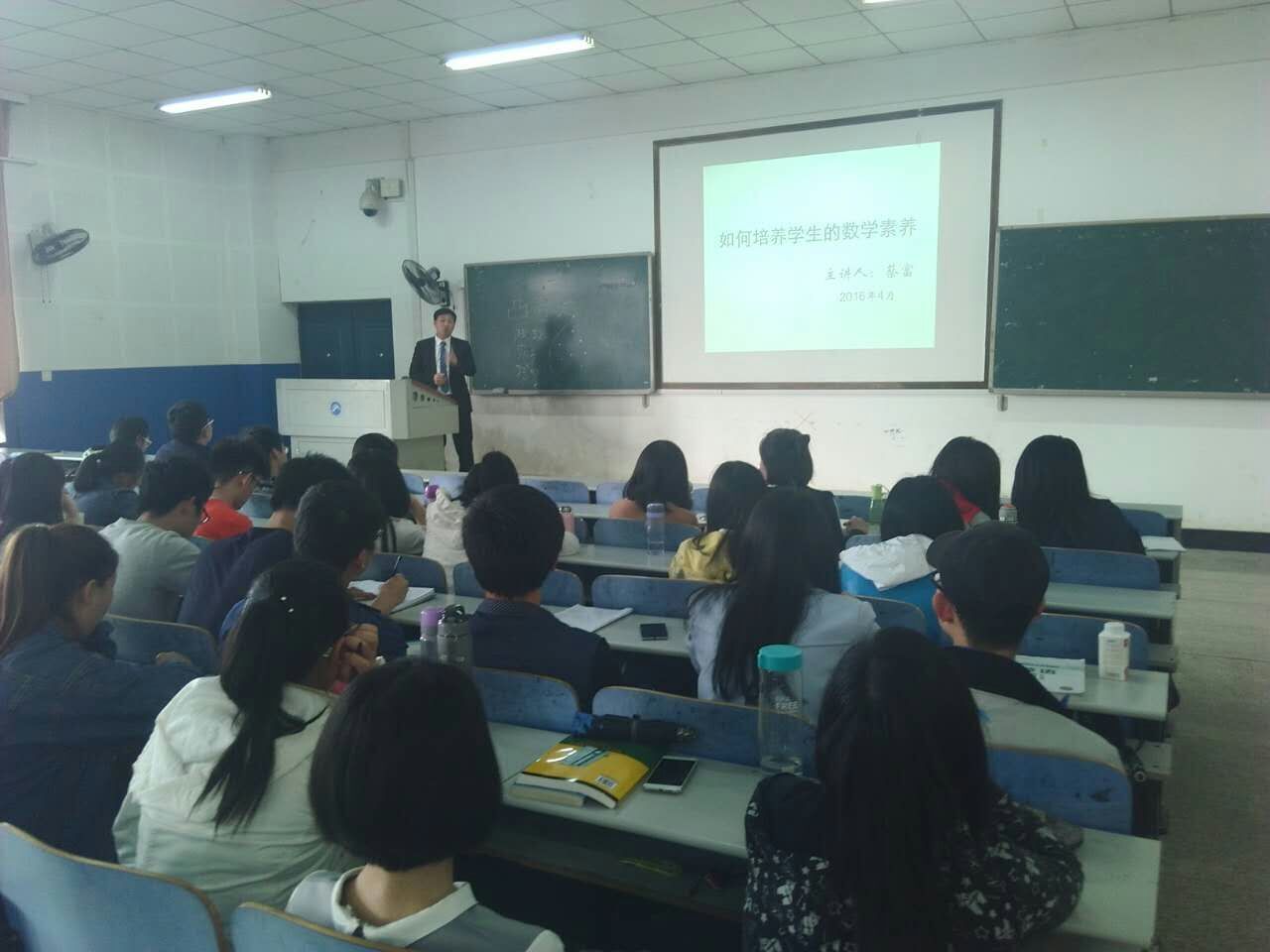 4月27日下午,知明教育集团蔡富副董事长应公司邀请在第八教学楼3-3教室作了题为“如何培养员工的数学素养”的讲座,公司13级数学与应用数学专业全体员工和部分老师参加了此次讲座。