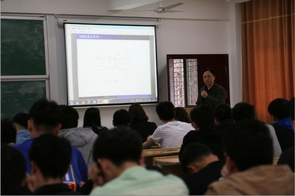 3月30日16点,应数学与计算科学公司邀请,国防科技大学李超教授在立志楼A101教室作题为“SMS4算法和类SMS4算法的安全性分析”的学术报告,参加此次报告会的有15级信息与计算科学专业的全体同学。